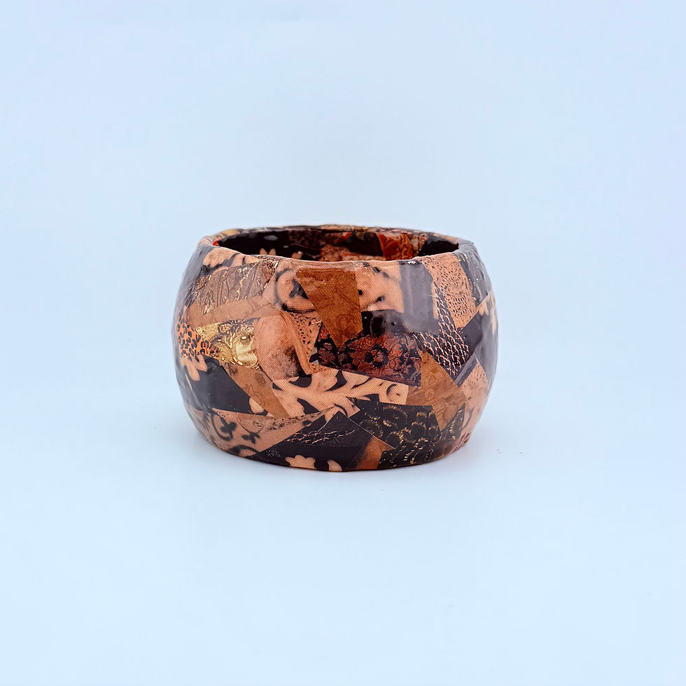This decoupaged bangle is a whole mood. Handcrafted from decoupaged paper on wood and layered with bold color and pattern, it’s playful, punchy, and impossible to ignore. Every angle brings something new with little surprises of color that catch the light and keep things interesting.