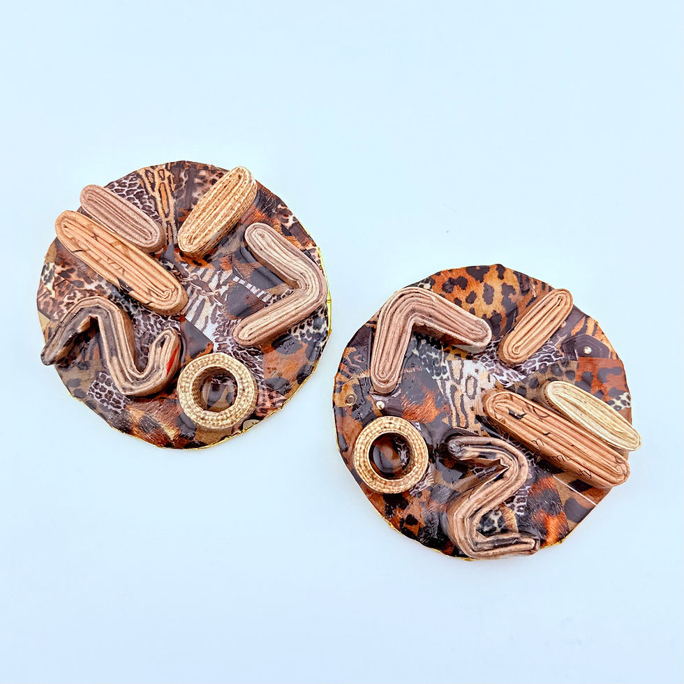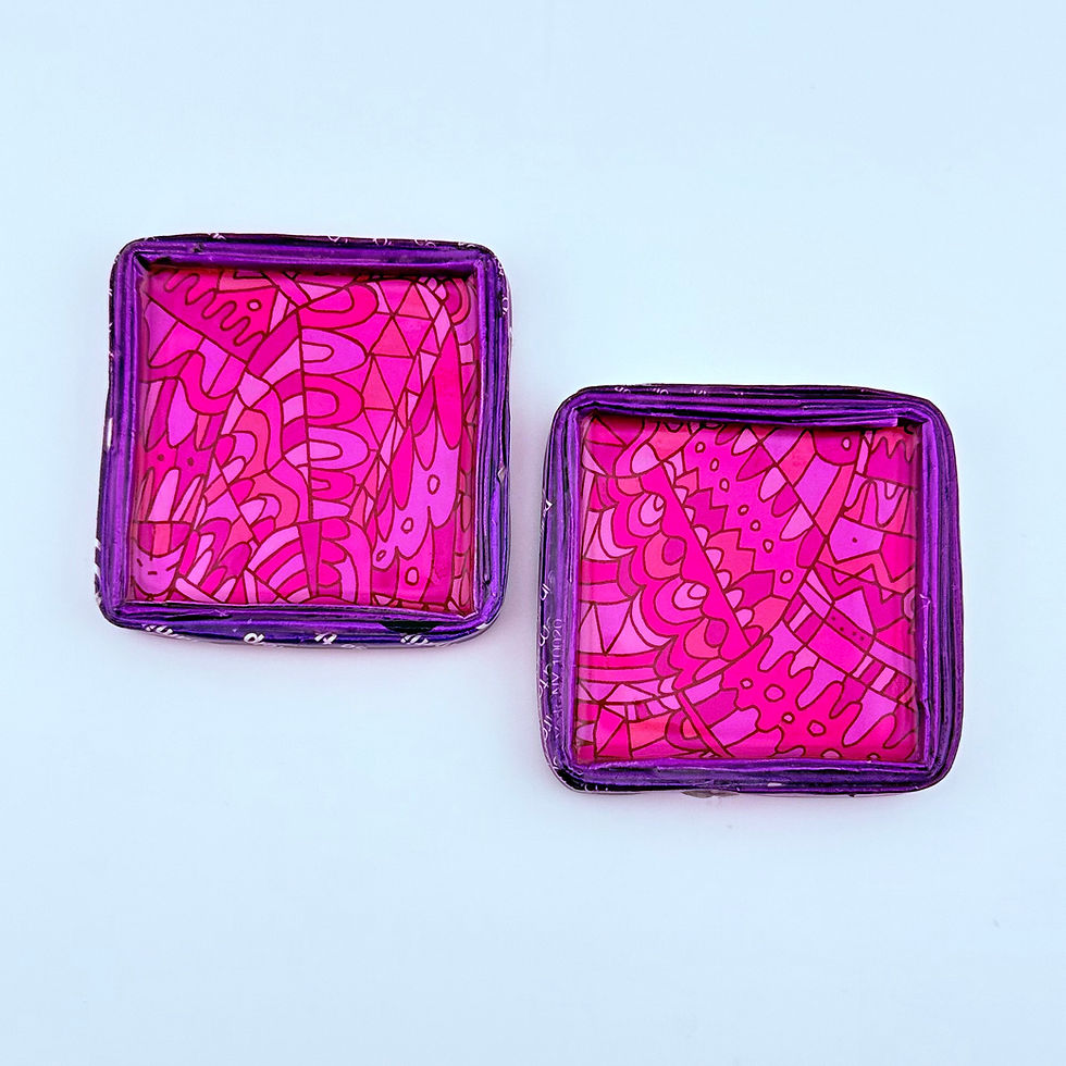 Gold-trimmed self expressive Stud Earrings created using a variety of upcycled paper (wallpaper, wrapping paper, cereal boxes, etc) and covered with a glass sealant.
